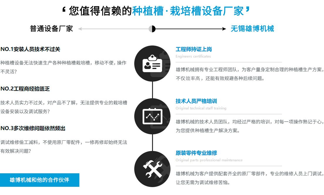 您在選擇雄博產品的同時,也選擇無微不至的終身服務。可根據不同客戶實際需求進行種植槽設備,栽培槽設備等的特殊工藝設計制造專業(yè)一對一售前/售后/技術咨詢指導,享受更貼心/放心的設備使用體驗。